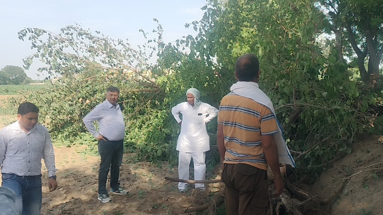 | काटे गए पेडों को विभागीय अधिकारियों को दिखाते किसान नेता श्याम सिंह चाहर व ग्रामीण |