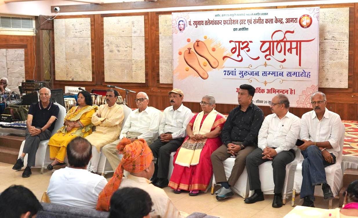 आगरा :पं. रघुनाथ तलेगाँवकर फाउंडेशन ट्रस्ट एवं संगीत कला केन्द्र, आगरा के संयुक्त तत्वावधान में ग्रांड होटल आगरा के मुख्य सभागार में 75वां गुरुजन सम्मान समारोह एवं गुरुपूर्णिमा महोत्सव अत्यंत भव्यता एवं श्रद्धा के साथ संपन्न हुआ। कार्यक्रम की शुरुआत प्रथम पूज्य गणपति एवं मां सरस्वती की प्रतिमा के समक्ष दीप प्रज्वलन से हुई। पं. विष्णु दिगम्बर पलुस्कर, पं. विष्णु नारायण भातखण्डे, पं. रघुनाथ तलेगाँवकर, सुलभा जी, रानी सरोज गौरीहार, उस्ताद लल्लू सिंह एवं संगीत नक्षत्र पं. केशव जी के चित्रों पर माल्यार्पण कर गुरुओं को नमन किया गया।