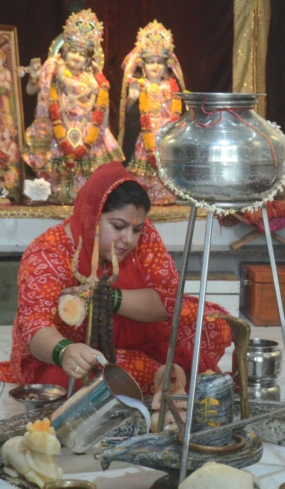 | शिव मंदिर में दुग्धाभिषेक करती महिला श्रद्धालु |