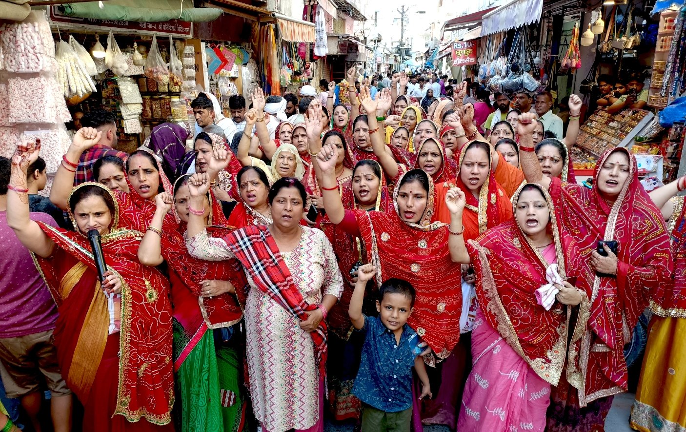 बांकेबिहारी मंदिर न्यास और गलियारा निर्माण के विरोध में महिलाओं का पैदल मार्च, सती माता से प्रार्थना कर माँगा न्याय