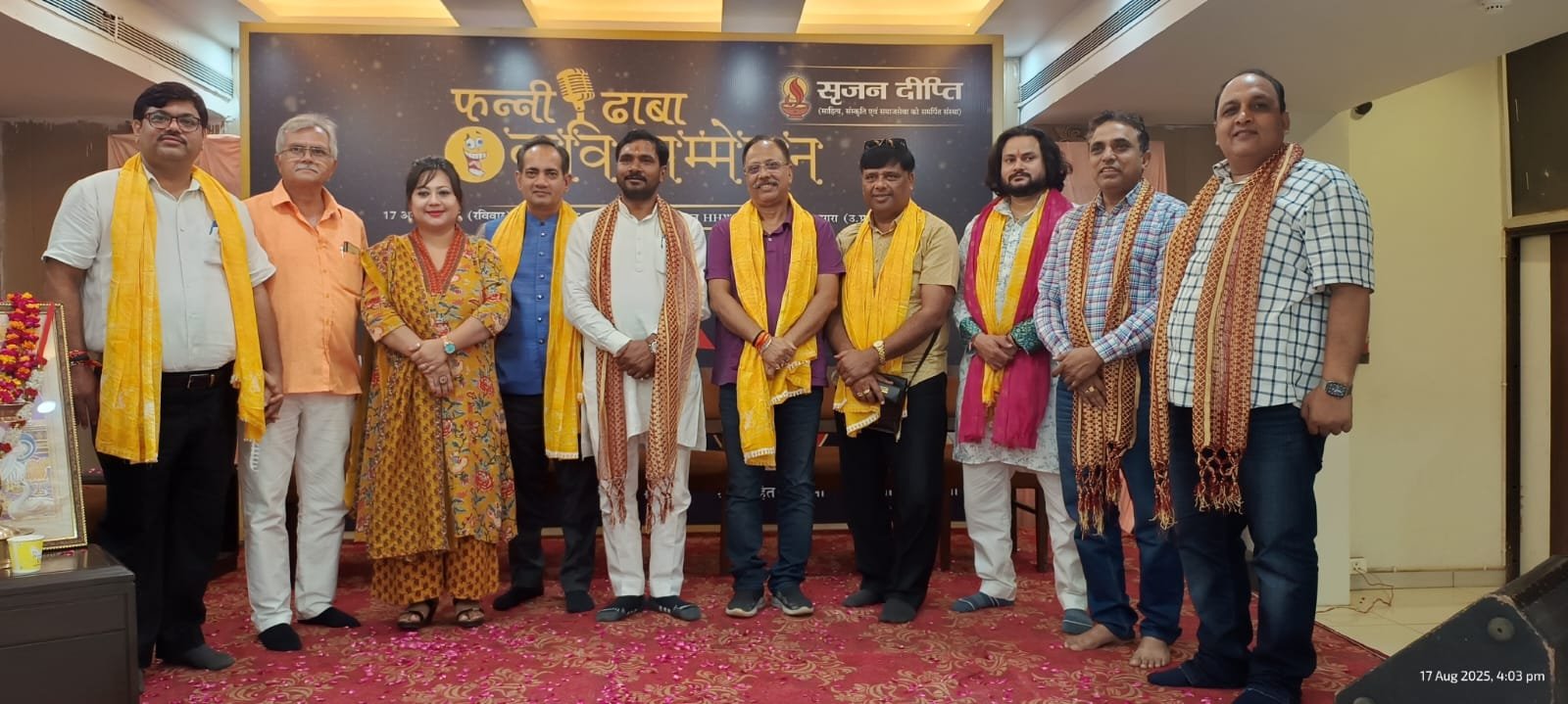 आगरा। सृजन दीप्ति संस्था द्वारा 17 अगस्त 2025 को फतेहाबाद रोड स्थित होटल में वार्षिक फन्नी ढाबा कवि सम्मेलन का आयोजन किया गया। कार्यक्रम में हास्य कवि पवन आगरी, व्यंग्यकार डॉ. अनुज त्यागी, शायरा सलोनी राणा, ओज कवि मोहित सक्सेना और गीतकार अभिषेक शर्मा ने अपनी रचनाओं से श्रोताओं को मंत्रमुग्ध किया। सम्मेलन की अध्यक्षता प्रो. वेद प्रकाश त्रिपाठी ने की और मुख्य अतिथि समर बहादुर सिंह रहे। आयोजन में हास्य, व्यंग्य, ओज, श्रृंगार और गीतों की अनोखी प्रस्तुति ने सभी दर्शकों का दिल जीत लिया।