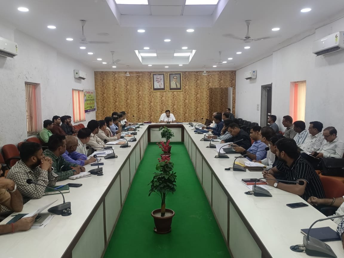 | अधीनस्थों के साथ मीटिंग में सड़क हादसे रोकने के उपायों पर चर्चा करते डीएम अरविंद मल्ल्प्पा बंगारी |