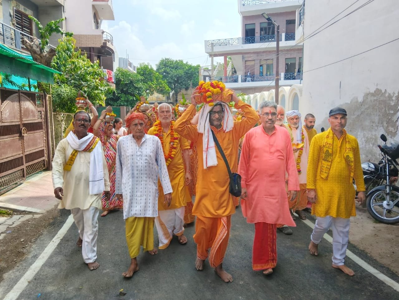 पूजन के बाद बैंडबाजे की धुन पर पीले वस्त्र धारी महिलाओं ने सिर पर मंगल कलश रखकर मंगल गीत और भजन गाते हुए कलश यात्रा निकाली। यात्रा जैसे ही निकली, पूरा बालाजीपुरम, सुभाष नगर और अलबतिया क्षेत्र भक्ति में डूब गया।