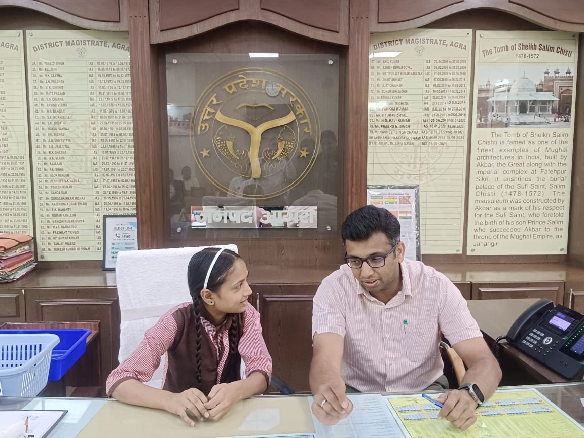 आगरा।मुख्यमंत्री योगी आदित्यनाथ के निर्देशन में चल रहे मिशन शक्ति 5.0 अभियान के तहत बालिकाओं को सशक्त बनाने और नेतृत्व क्षमता विकसित करने के उद्देश्य से शुक्रवार को आगरा की श्यामा देवी कंपोजिट विद्यालय की कक्षा 8 की छात्रा गुलाल ने एक दिन के लिए जिलाधिकारी आगरा का दायित्व संभाला।