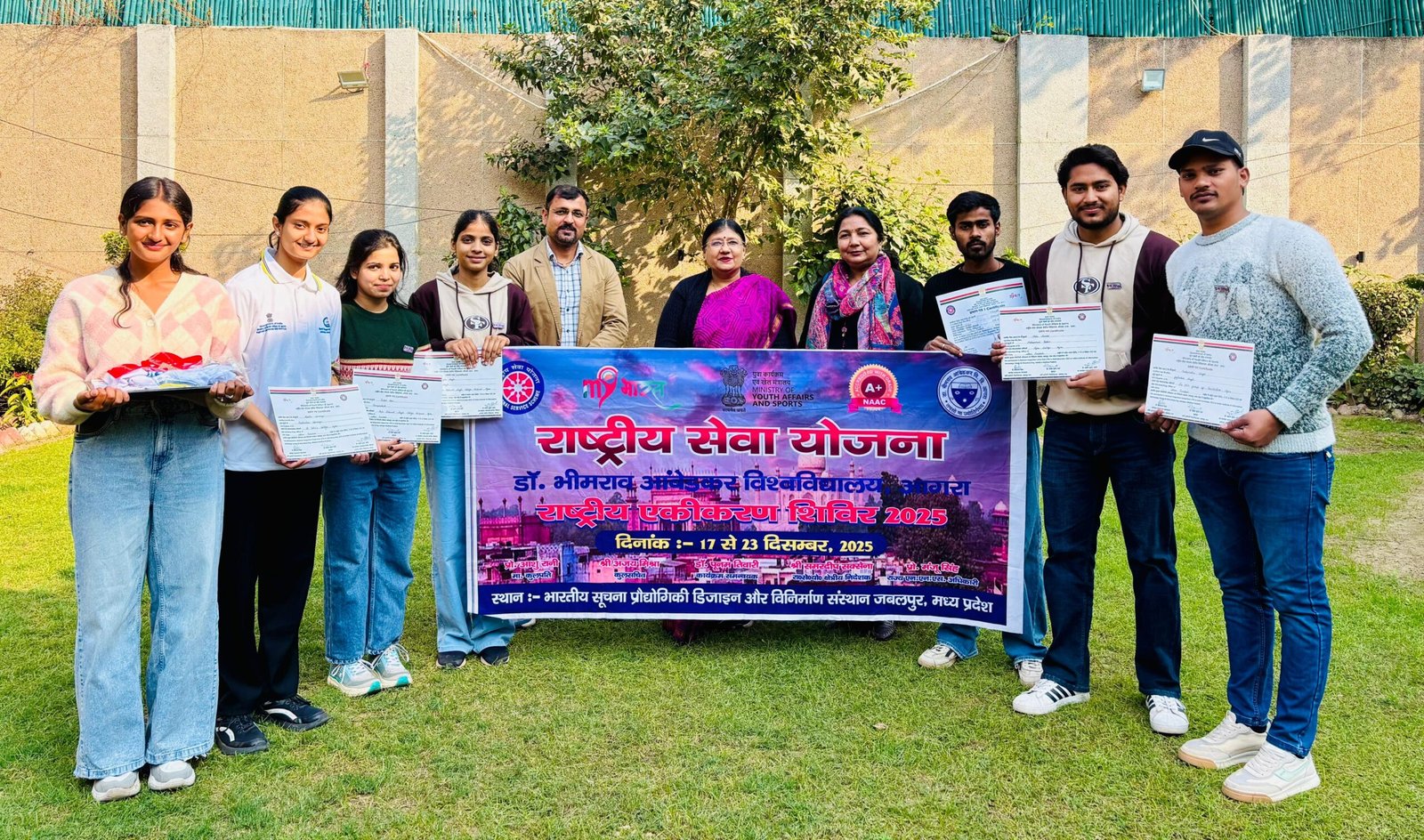 आगरा। डॉ. भीमराव आंबेडकर विश्वविद्यालय, आगरा के राष्ट्रीय सेवा योजना (एनएसएस) प्रकोष्ठ का दल 17 से 23 दिसंबर 2025 तक मध्य प्रदेश के भारतीय सूचना प्रौद्योगिकी डिजाइन एवं विनिर्माण संस्थान भारतीय सूचना प्रौद्योगिकी, डिजाइन एवं विनिर्माण संस्थान), जबलपुर में आयोजित राष्ट्रीय एकीकरण शिविर में भाग लेने के बाद आगरा लौट आया। शिविर में विश्वविद्यालय के 9 स्वयंसेवक और 1 कार्यक्रम अधिकारी शामिल हुए। आगरा आगमन पर विश्वविद्यालय और एनएसएस प्रकोष्ठ की ओर से दल का स्वागत किया गया।