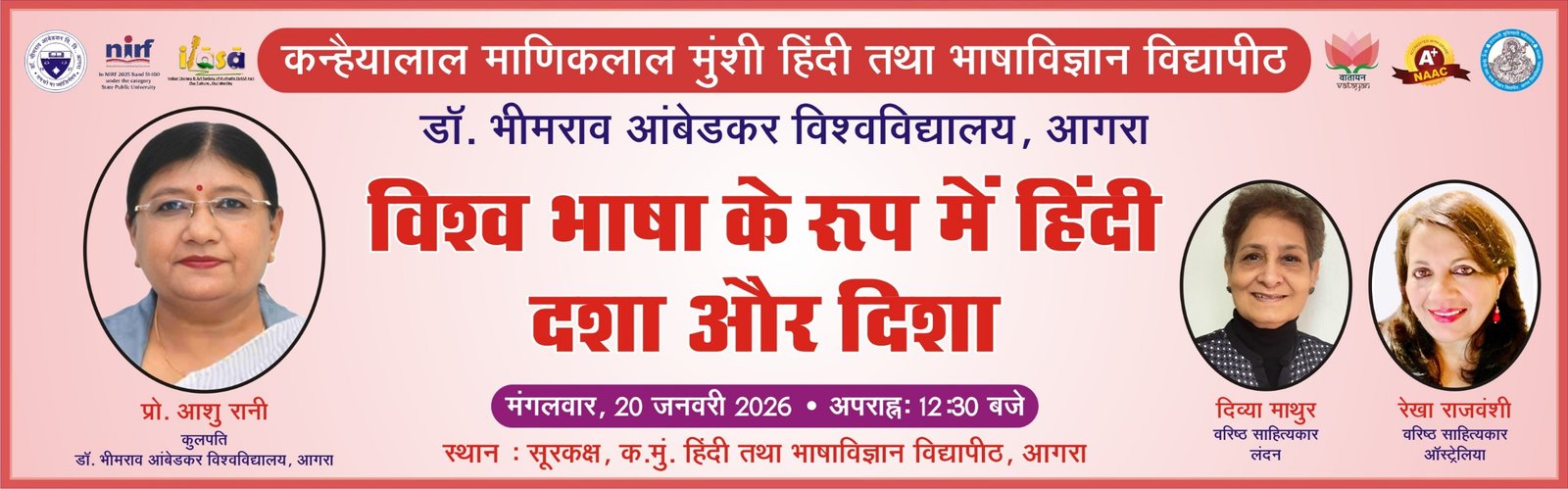 कार्यक्रम की अध्यक्षता विश्वविद्यालय की कुलपति प्रो. आशु रानी करेंगी। विद्यापीठ के निदेशक प्रो. प्रदीप श्रीधर ने जानकारी देते हुए बताया कि इस अंतरराष्ट्रीय व्याख्यानमाला में हिंदी की वैश्विक स्थिति, वर्तमान चुनौतियों और भविष्य की संभावनाओं पर गहन चर्चा की जाएगी। कार्यक्रम में लंदन से वरिष्ठ साहित्यकार दिव्या माथुर तथा ऑस्ट्रेलिया से वरिष्ठ साहित्यकार रेखा राजवंशी विशेष वक्ता के रूप में अपने विचार प्रस्तुत करेंगी।