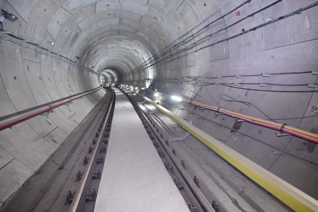 भूमिगत ट्रैक निर्माण की प्रक्रिया के तहत सबसे पहले स्टेशन का निर्माण किया जाता है। स्टेशन का ढांचा तैयार होने के बाद लॉन्चिंग शाफ्ट बनाकर टनल बोरिंग मशीन (टीबीएम) को लॉन्च किया जाता है। टीबीएम मशीन से गोलाकार टनल तैयार होती है। चूंकि टनल गोलाकार होती है, इसलिए सीधे ट्रैक बिछाना संभव नहीं होता। इसके लिए ट्रैक स्लैब की कास्टिंग की जाती है और उस पर बैलास्टलेस ट्रैक बिछाया जाता है।