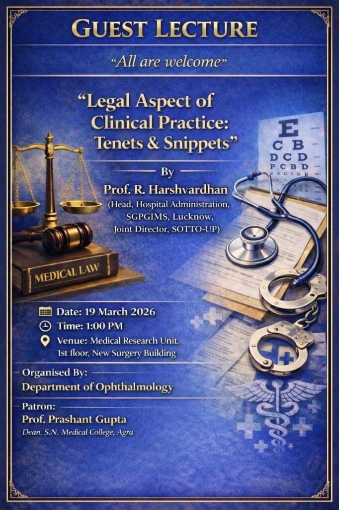 इस महत्वपूर्ण उद्घाटन कार्यक्रम में मुख्य अतिथि के रूप में प्रोफेसर आर. हर्षवर्धन, विभागाध्यक्ष हॉस्पिटल एडमिनिस्ट्रेशन, SGPGIMS लखनऊ एवं जॉइंट डायरेक्टर, सोटो यूपी, शामिल होंगे। उद्घाटन समारोह सुबह 11:30 बजे ऑप्थल्मोलॉजी विभाग, एस.एन. मेडिकल कॉलेज में संपन्न होगा। इसके पश्चात दोपहर 1:00 बजे मुख्य अतिथि चिकित्सकों और मेडिकल छात्रों के लिए MRU हॉल, नई सर्जरी बिल्डिंग (प्रथम तल) में एक विशेष एकेडमिक लेक्चर देंगे। यह व्याख्यान आधुनिक कॉर्निया प्रत्यारोपण तकनीक, ऑपरेशन प्रक्रिया और मरीजों की देखभाल के सर्वोत्तम प्रोटोकॉल पर केंद्रित होगा।