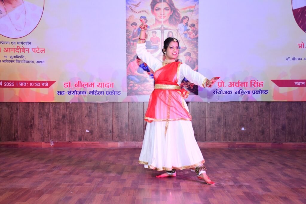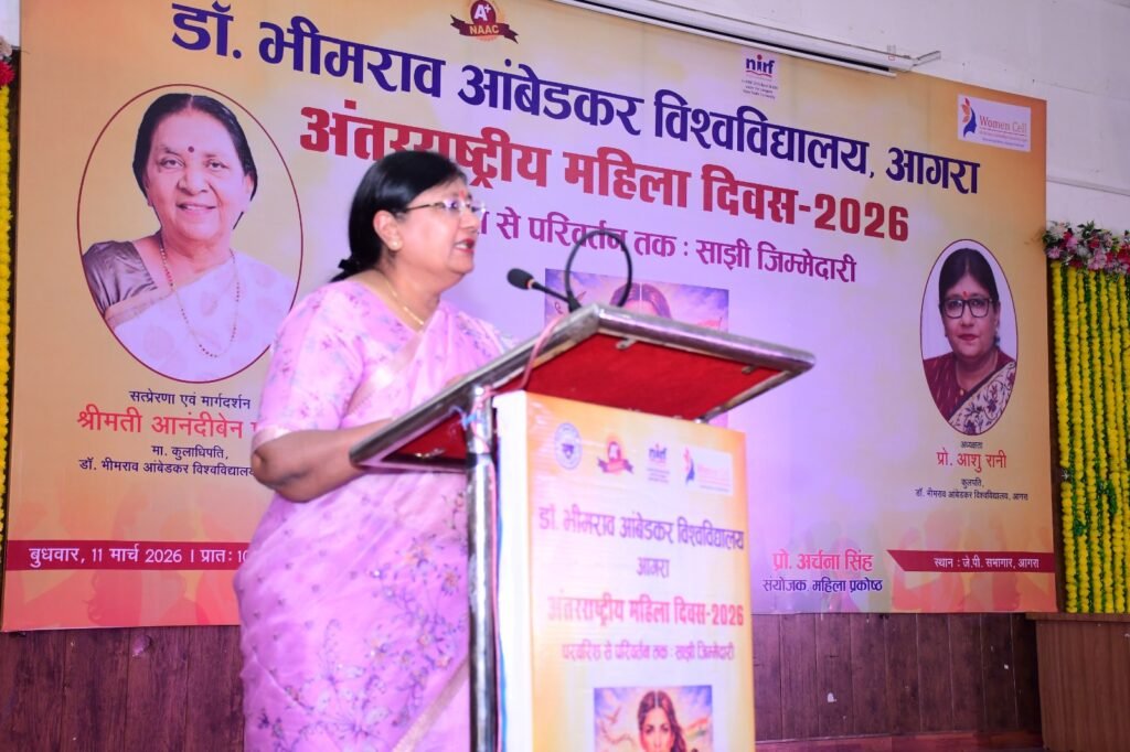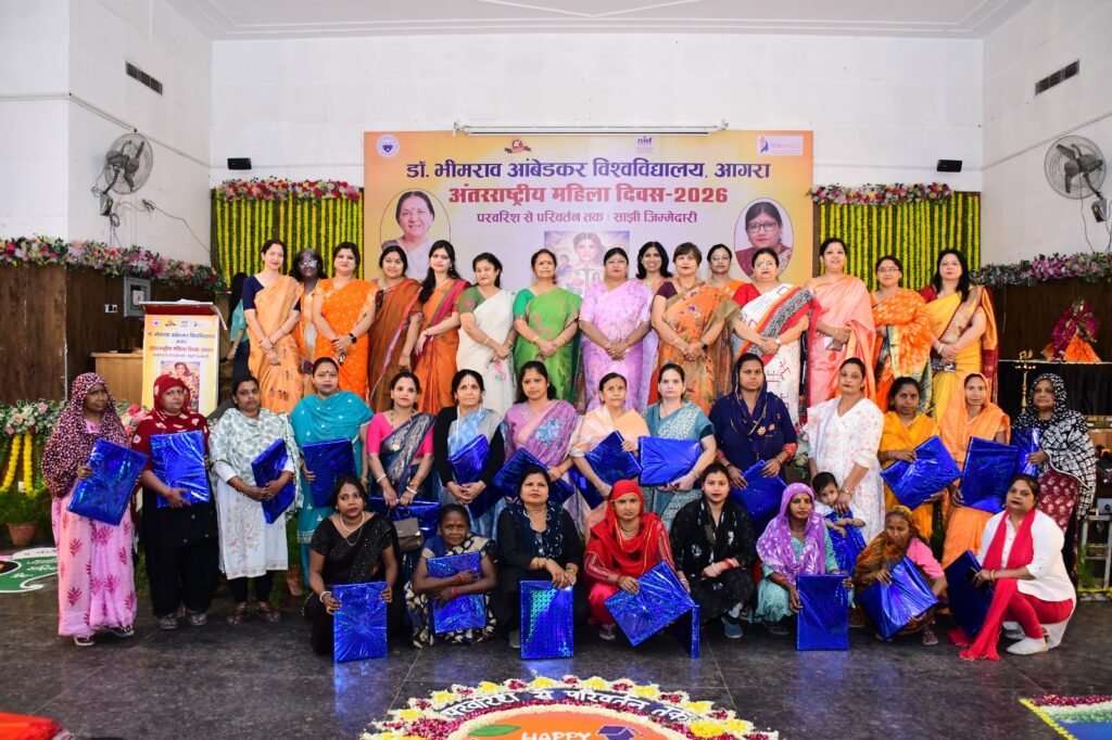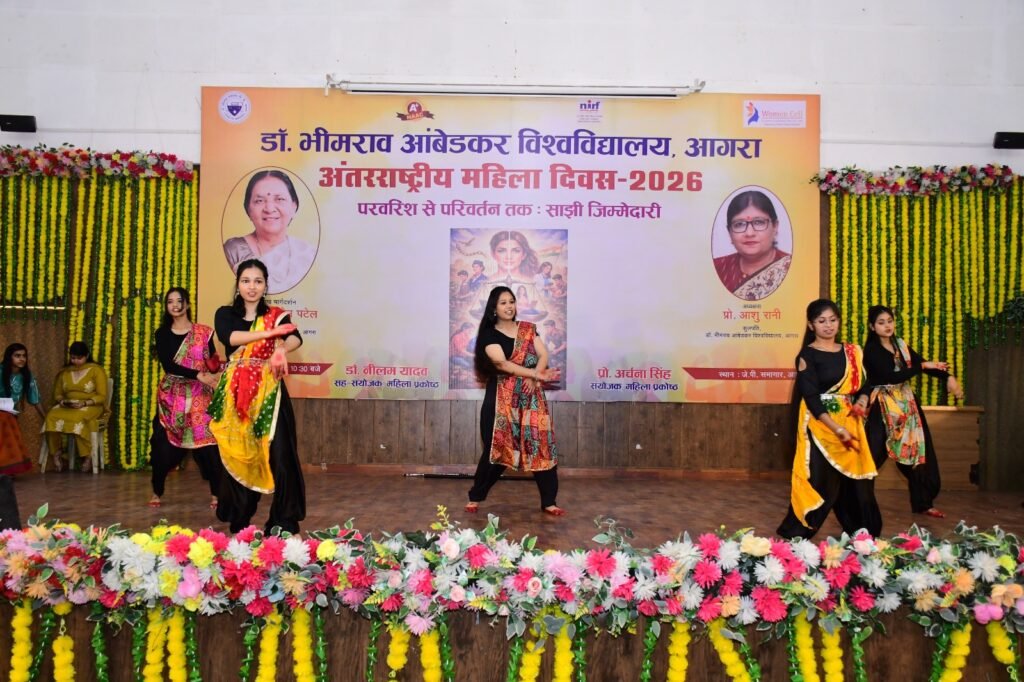 आगरा। डॉ. भीमराव आंबेडकर विश्वविद्यालय, आगरा के स्वामी विवेकानंद खंदारी परिसर स्थित जेपी सभागार में बुधवार को अंतरराष्ट्रीय महिला दिवस के उपलक्ष्य में आयोजित चार दिवसीय कार्यक्रम का गरिमामय समापन हुआ। कार्यक्रम की अध्यक्षता विश्वविद्यालय की कुलपति प्रो. आशु रानी ने की। महिला प्रकोष्ठ द्वारा आयोजित इस समारोह में महिला उद्यमियों तथा विश्वविद्यालय की कर्मठ चतुर्थ श्रेणी महिला कर्मचारियों को सम्मानित किया गया। साथ ही छात्र-छात्राओं की रंगारंग सांस्कृतिक प्रस्तुतियों ने सभागार में उत्साह और उल्लास का वातावरण बना दिया।