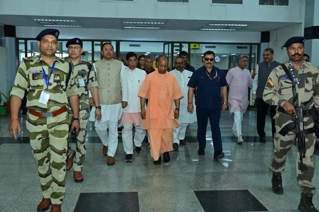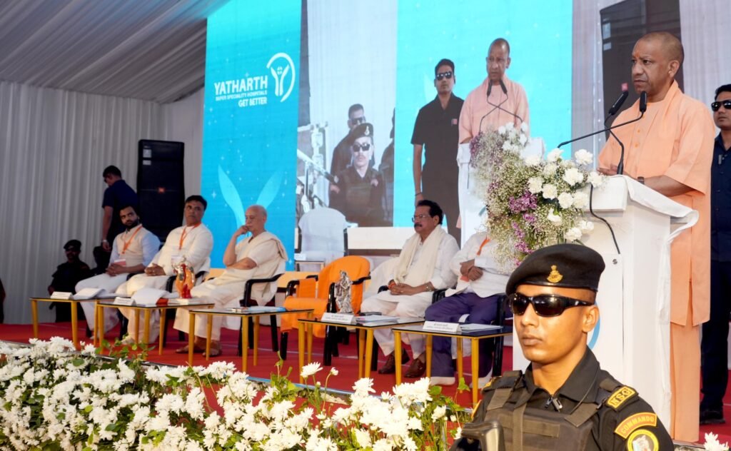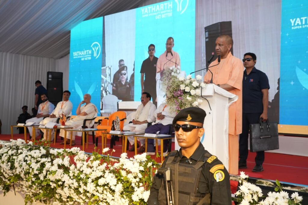 Uttar Pradesh Chief Minister Yogi Adityanath visiting Agra for an official political event, interacting with local leaders and the public.प्रदेश के मुख्यमंत्री योगी आदित्यनाथ यथार्थ सुपर स्पेशलिटी हॉस्पिटल का उद्घाटन करते हुए।