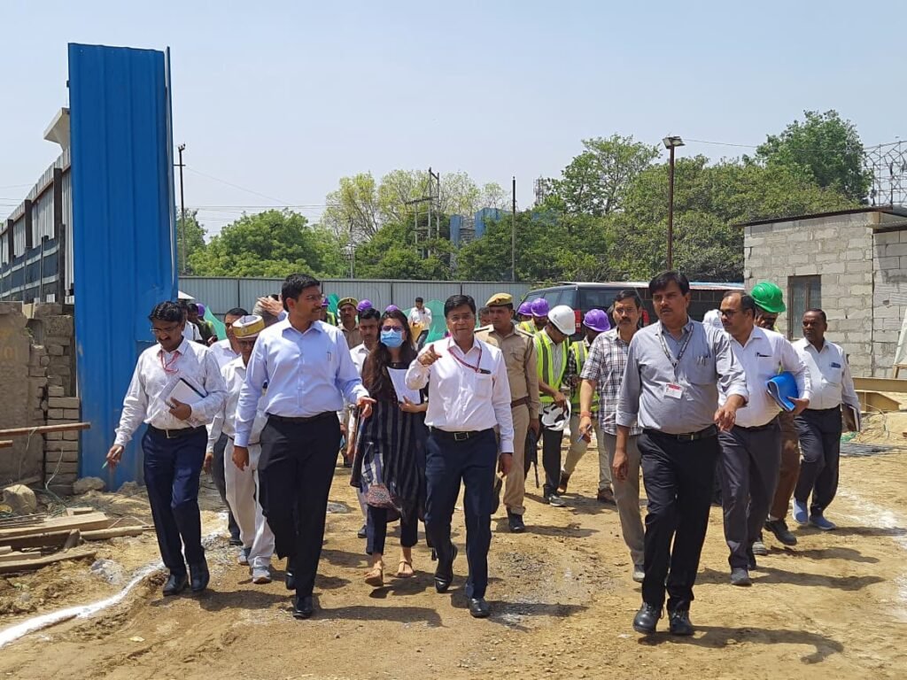 एसएन मेडिकल कॉलेज में निर्माणाधीन बिल्डिंग का निरीक्षण करते डीएम मनीष बंसल।