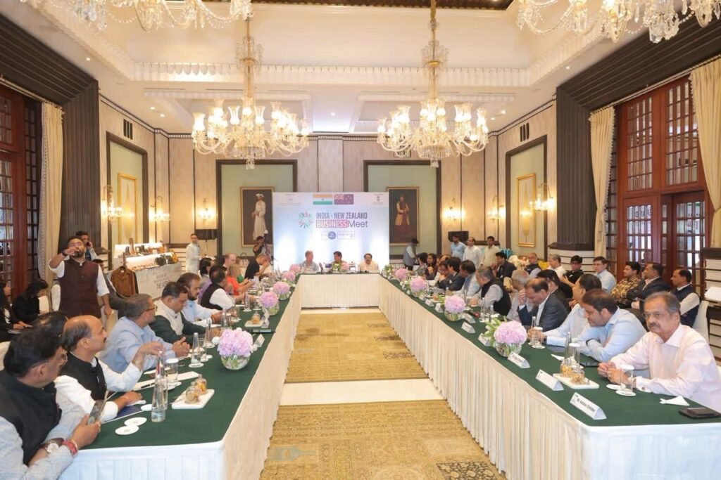 Piyush Goyal meeting with New Zealand delegation, Prof. S.P. Singh and Agra traders discussing international trade and export opportunities in AgraUnion Minister of Commerce and Industry Piyush Goyal, New Zealand delegation, Minister of State Prof. S.P. Singh, and Agra traders during an important business discussion in Agra.