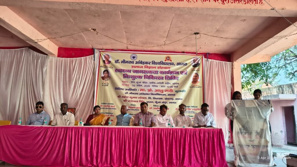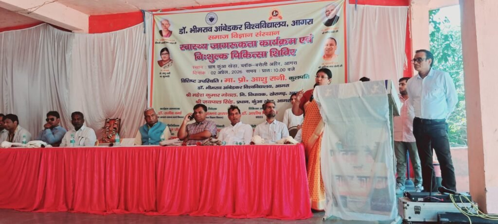 आगरा। डॉ. भीमराव आंबेडकर विश्वविद्यालय द्वारा सामाजिक उत्तरदायित्व की दिशा में एक महत्वपूर्ण कदम उठाते हुए ग्राम कुंआ खेड़ा, ब्लॉक बरौली अहीर में निःशुल्क चिकित्सा शिविर एवं स्वास्थ्य जागरूकता अभियान का सफल आयोजन किया गया। इस पहल ने ग्रामीण क्षेत्र में स्वास्थ्य सेवाओं की पहुंच बढ़ाने के साथ-साथ लोगों में जागरूकता फैलाने का भी कार्य किया।