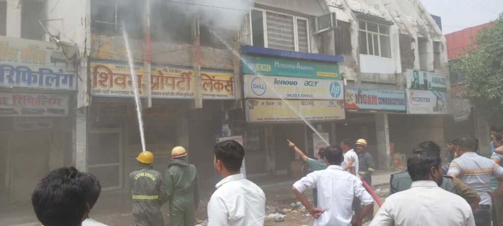 आगरा संजय प्लेस स्काई टावर में कंप्यूटर गोदाम में आग लगी।