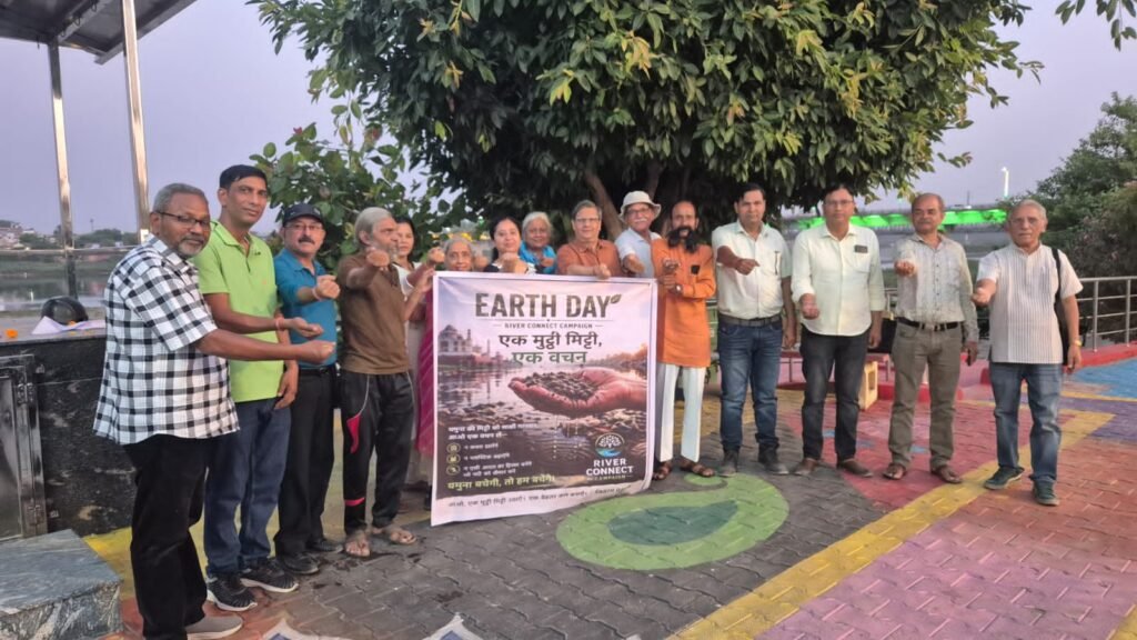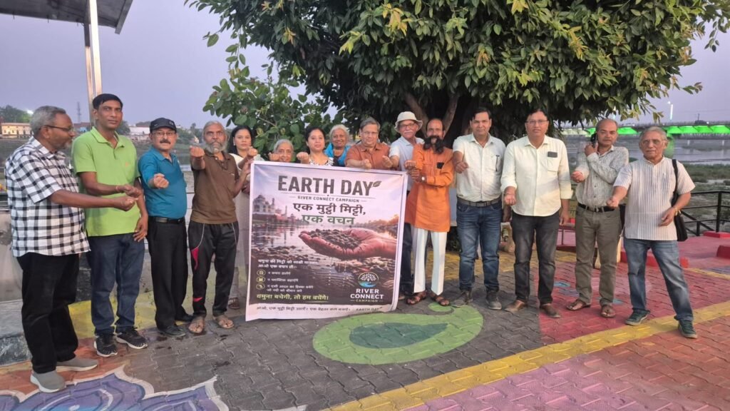 Volunteers and citizens gathered at Yamuna Aarti Ghat in Agra during Earth Day, participating in the “One Handful of Soil, One Promise” campaign under the River Connect initiative, taking a pledge for river conservation, plastic-free living, and environmental protection along the Yamuna riverbank.