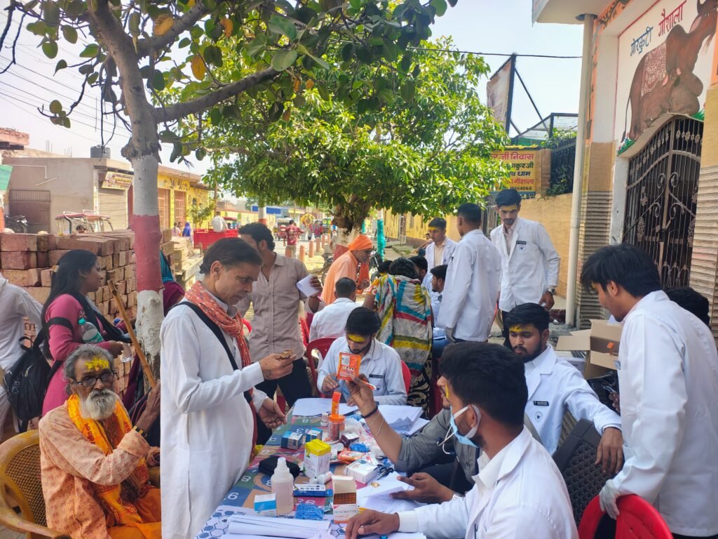 Pharmacy students of Dr. Bhimrao Ambedkar University conducting free health checkup of 400 saints and elderly people at Mor Kuti Ashram Vrindavan during Akshaya Tritiya health campवृंदावन स्वास्थ्य शिविर में संतों की नि:शुल्क जांच।