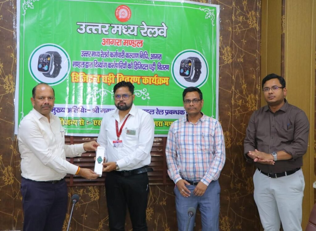 आगरा रेल मंडल में दिव्यांग कर्मचारियों के कल्याण और उनकी कार्यक्षमता को बढ़ाने की दिशा में एक महत्वपूर्ण पहल करते हुए कर्मचारी कल्याण निधि कमेटी द्वारा डिजिटल घड़ी वितरण कार्यक्रम का आयोजन किया गया। यह कार्यक्रम मंडल रेल प्रबंधक गगन गोयल के मार्गदर्शन एवं वरिष्ठ मंडल कार्मिक अधिकारी सनत जैन के निर्देशन में संपन्न हुआ। कार्यक्रम का उद्देश्य दिव्यांग कर्मचारियों को तकनीकी सहायता उपलब्ध कराकर उनके दैनिक कार्यों को अधिक सहज, सुरक्षित और आत्मनिर्भर बनाना था।