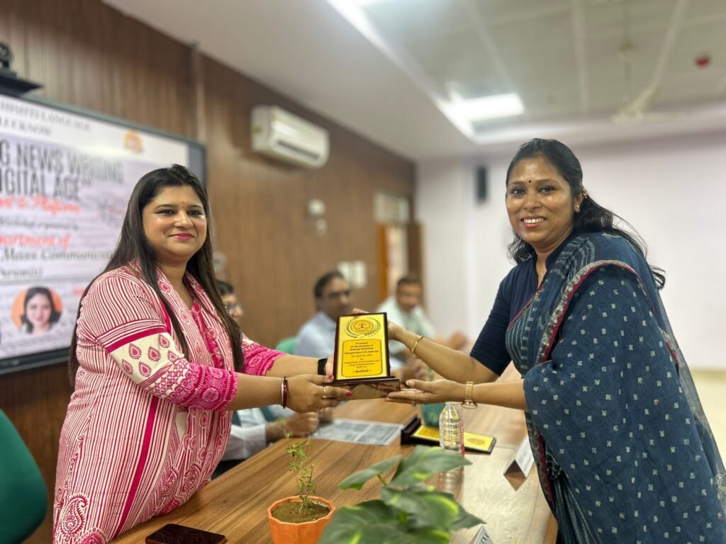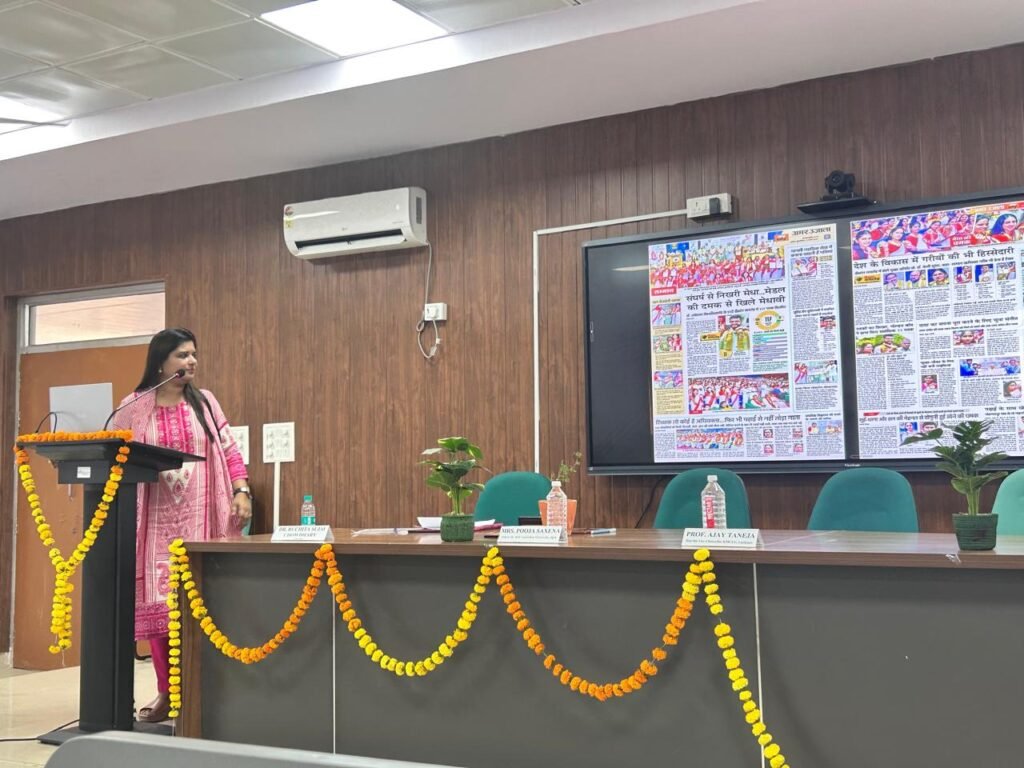 Expert Puja Saxena delivering lecture on digital journalism and AI in national workshop at DBRAU Agra and Lucknow university eventडिजिटल पत्रकारिता कार्यशाला में विशेषज्ञ पूजा सक्सेना का संबोधन।